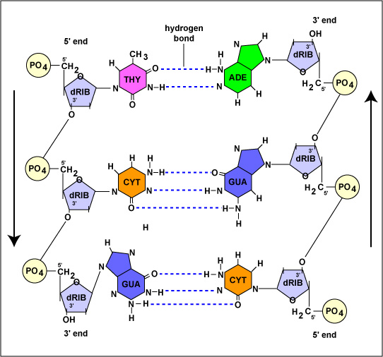 The phosphate of one deoxyribonucleotide binding to the 3' carbon of the deoxyribose of another forms the sugar-phosphate backbone of the DNA (the sides of the "ladder"). The hydrogen bonds between the complementary nucleotide bases (adenine-thymine; guanine-cytosine) form the rungs. Note the antiparallel nature of the DNA. One strand ends in a 5' phosphate and the other ends in a 3' hydroxyl.