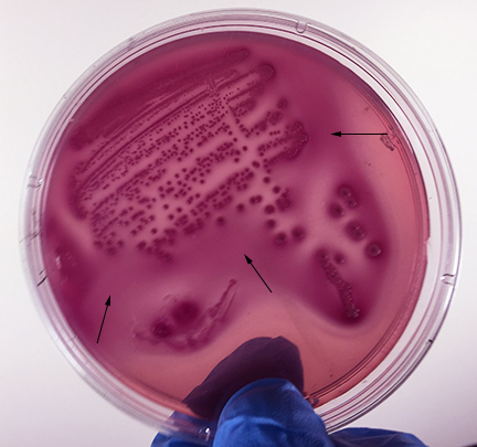 Strong fementation of lactose with high levels of acid production by the bacteria causes the colonies and confluent growth to appear bright pink to red. The resulting acid, at high enough concentrations, can also causes the bile salts in the medium to precipitate out of solution causing a pink precipitate (cloudiness to appear around the the growth (arrows).