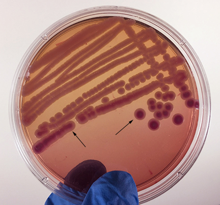 Weak fermentation of lactose by the bacteria causes the colonies and confluent growth to appear pink with red centers (arrows), but without the precipitation of bile salts there is no pink halo around the growth.