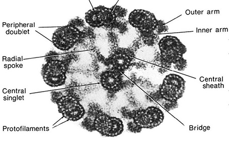 This thin section electron micrograph shows a cross section of a cilium from a rat tracheal epithelial cell. Note the 2 X 9 + 2 arrangement of microtubules and the dynein arms.