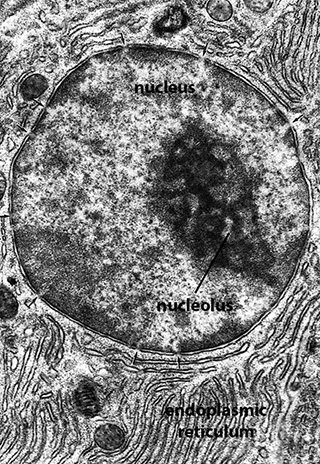 Transmission electron micrograph of a pancreatic acinar cell from a bat. Note the nuclear membrane,