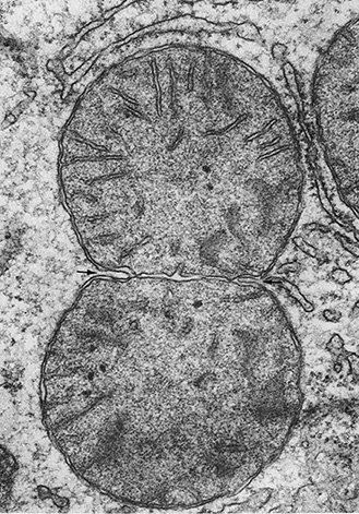 Dividing mitochondrion (arrow) in a cell from the liver of a rat